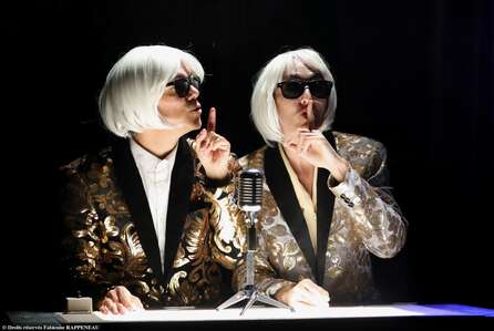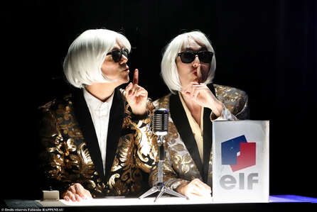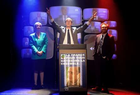 JACQUES serre des mains, chérit le fric, tapote le cul des vaches, déconne et adore l’art. CHIRAC bise les dictateurs, pilonne et pille l’Afrique ; il commence sous De Gaulle, Pom pom pidou… et avoue ses crimes : c’est un roi nu. Trois comédiens font virevolter plus de 20 personnages : Dassault, Bernadette, Pasqua, Marie France Garaud, Pierre Juillet, Claude Chirac, Sarkozy et tout le gang de Jacques Chirac. Menteur comme personne et gargantuesque, c’est un personnage de théâtre. On va s’étonner et rire parce que c’est du théâtre et que le burlesque n’enlève rien au tragique.