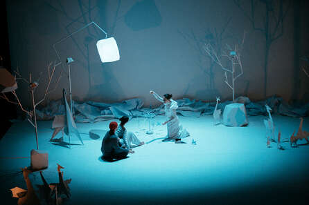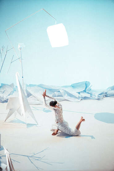Dans un monde de papier peuplé de créatures de plis et de formes, un voyageur surgit. Par sa danse fulgurante, il tente de se rapprocher d’une chimère, fluide et élastique, sous l’œil bienveillant de la gardienne des lieux. imagOri est une traversée chorégraphique et musicale où origamis minuscules ou gigantesques incarnent l’imaginaire de tous. La soprane, dans une langue inventée, tisse une atmosphère féérique, mêlant mélodie et mystère. Les corps dessinent des formes irréelles, se figent et vibrent, explorant l’altérité et la rencontre avec l’autre. Entre performance et minimalisme, mouvement et musique s’entrelacent pour créer un univers sensoriel où le geste, la voix et le papier donnent vie à un rêve partagé.
