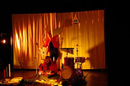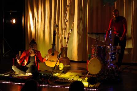 A l’entrée du spectacle, les enfants s’installent, sur des coussins, des tapis, dans une ambiance « comme à la maison ». Les musiciens sont assis au sol, entourés de leurs instruments et d’une atmosphère tamisée.