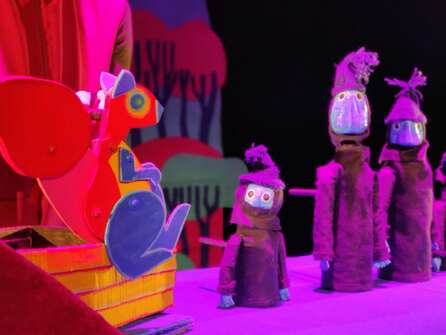 La mise en scène mêle théâtre visuel, marionnettes, jeu d’acteur et musique dans un univers graphique inspiré du livre. La scénographie se déploie comme un livre pop-up grandeur nature : formes simples, couleurs franches et jeux de volumes composent un espace ludique et lisible, en constante transformation.