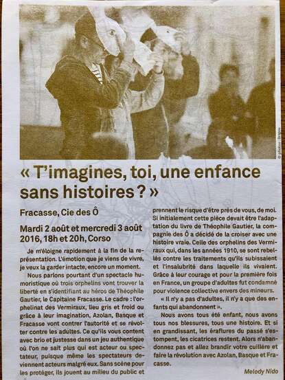 Azolan, Basque et Fracasse sont trois orphelins qui volent Le Capitaine Fracasse de Théophile Gautier et trouvent la liberté grâce à ce héros de papier : ils vous convient à leur table pour vous raconter l’histoire de leur révolte contre l’autorité, les adultes et la confiscation des imaginaires. Avec humour et dans un élan frondeur, les trois personnages tendent à chacun le miroir de son Fracasse, la petite fêlure qui fait la cicatrice de l’enfance.